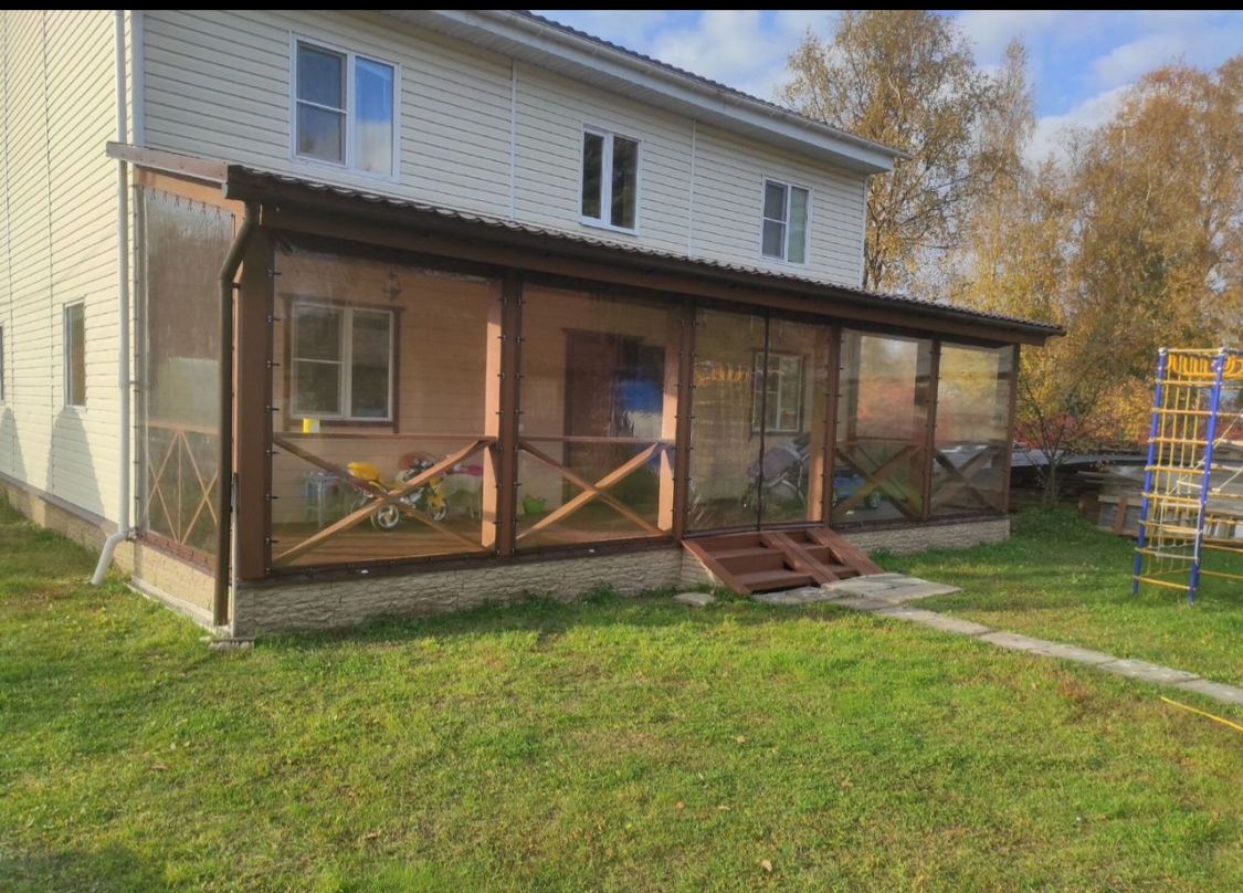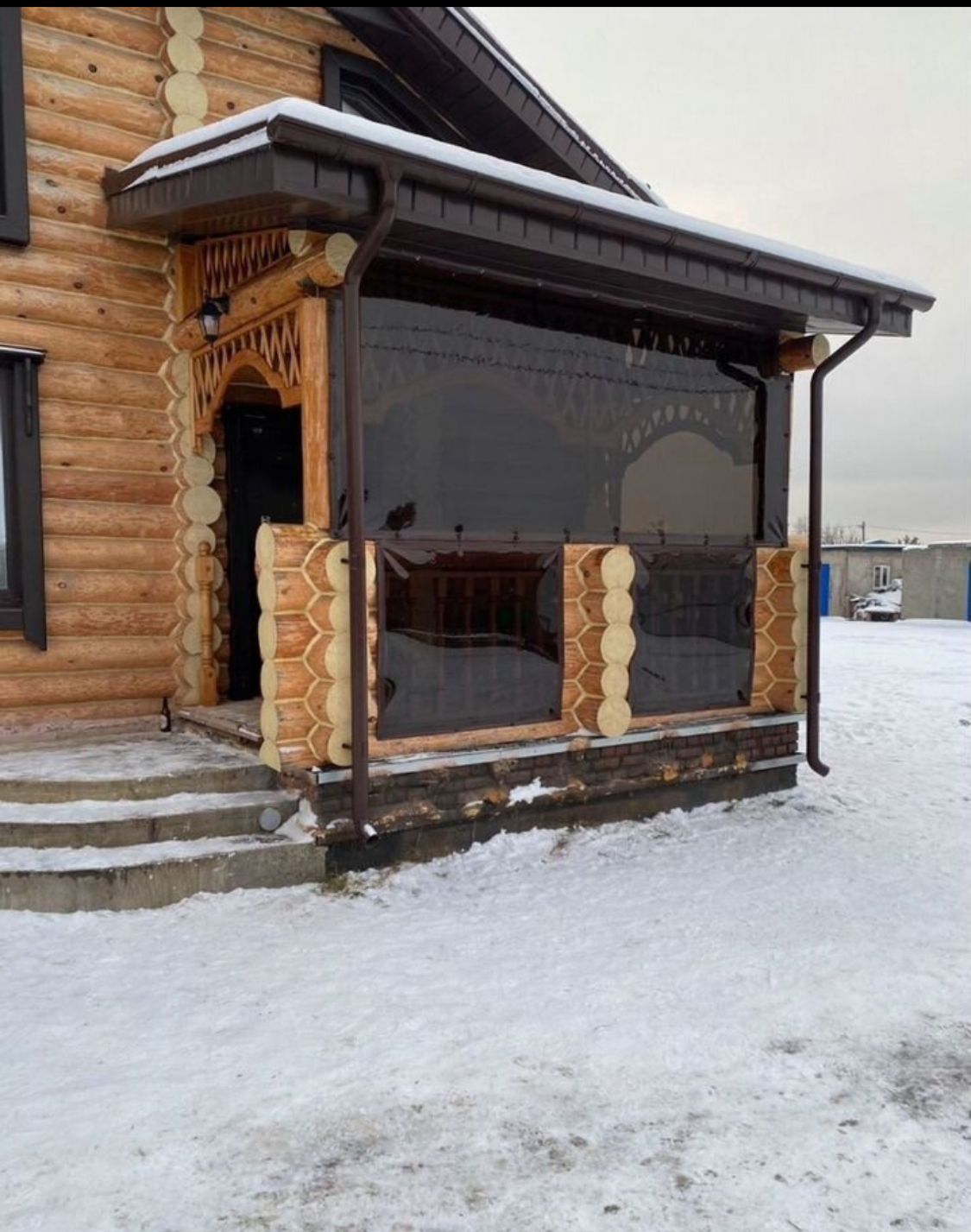 Пленка 700 мкм, морозостойкая до -39°C. Окантовка пвх цвет коричневый, пластиковая поворотная скоба по бокам, верх саморезы, низ без крепления, с монтажом.